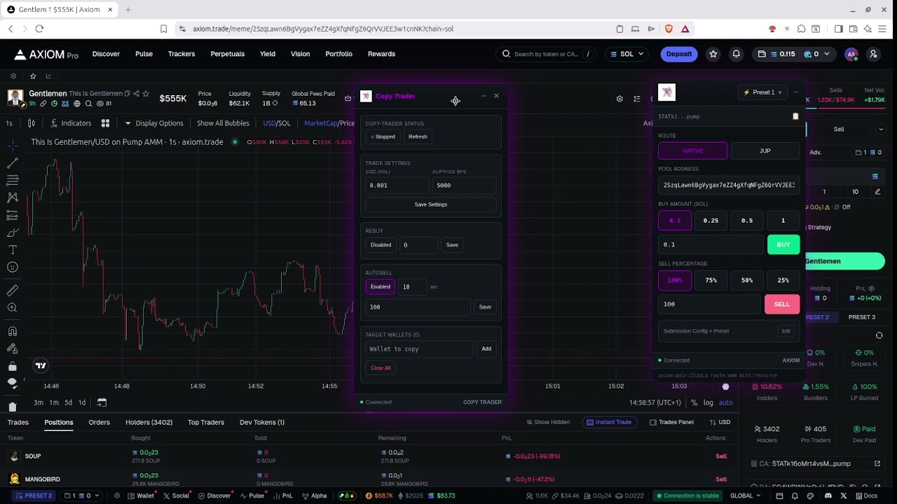 Paste a Solana wallet, choose sizing rules, and configure advanced limits (allocation, frequency, stop conditions). You can also use strategy-style controls for more specialized copy setups. The bot mirrors trades based on your settings.